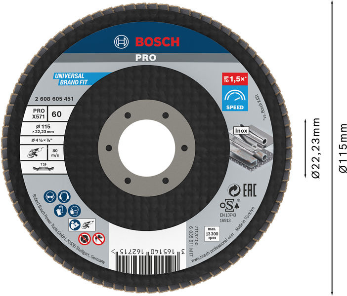 Až 1,5× rýchlejšie ako lamelový brúsny kotúč Bosch X431 - Lamelové brúsne kotúče ponúkajú skvelé spojenie odolnosti a rýchleho úbytku materiálu a kotúč PRO X571 má ešte rýchlejší úbytok ako väčšina ostatných. Lamelový brúsny kotúč PRO X571 má podklad z tkaniny X pre stabilné brúsenie. Pokročilé spojenie zŕn oxidu hlinitého a oxidu zirkoničitého ponúka rýchly úbytok materiálu, takže lamelový kotúč je efektívnejší, aj keď ho používate na kalenej ocele. S otvorom 22,23 mm pre štandardné uhlové brúsky s ističnou maticou
