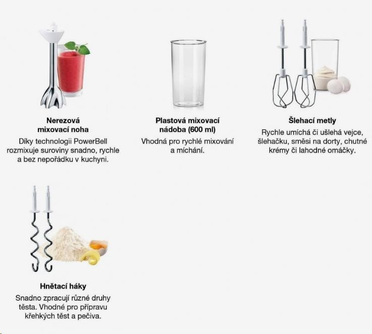 Ruční mixér Braun MultiMix 5 nabízí 750W výkonný motor a 9 rychlostí pro snadné a rychlé šlehání, hnětení a mixování. Vybrané modely současně nabízí také mixovací nohu s plastovou mixovací nádobou a sekací nástavec, takže se MultiMix 5 stává šlehačem, tyčovým mixérem a sekáčkem v jednom. Technologie SmartMix a unikátní umístění motoru přímo nad příslušenství přenáší váhu přímo do mísy, nikoliv do vaší ruky, takže je šlehání a mixování až o 40 % lehčí. Design mixéru MultiMix je hladký a bez ventilačních otvorů. Díky tomu dovnitř mixéru nepronikají nečistoty a je zajištěna delší životnost produktu. Protiskluzová měkká rukojeť SoftGrip a snadná výměna příslušenství je příjemnou tečkou.