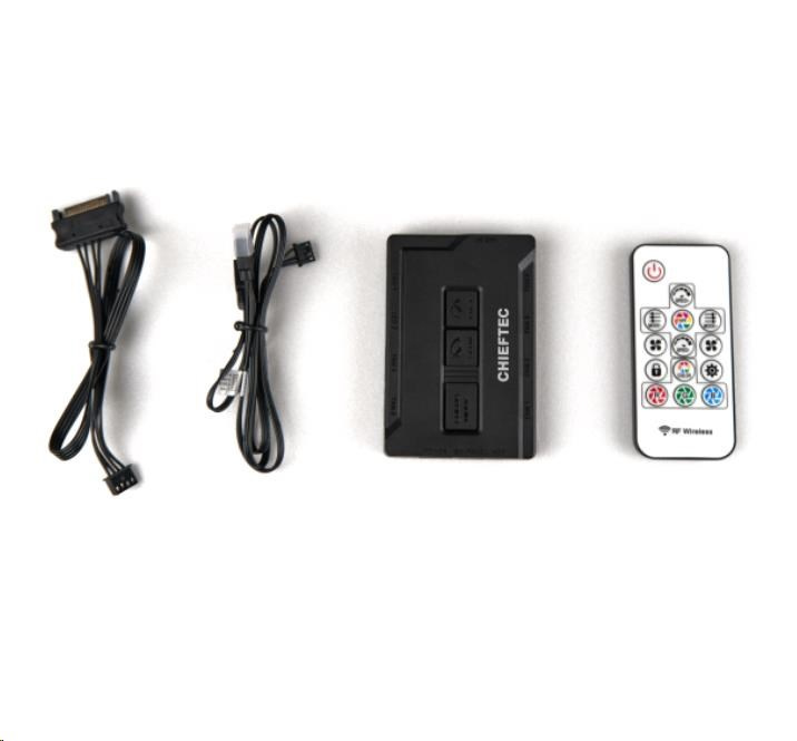 | rozsah dodávky | Sada skrutiek, návod na použitie, skrutky s palcom, diaľkové ovládanie Ovládací rozbočovač RGB (DF-908) s 3PIN +5V M/B Sync a napájacím káblom SATA Predná časť: 3x 120mm predinštalovaný dúhový ventilátor A-RGB Zadná časť: 1x 120mm predinštalovaný dúhový ventilátor A-RGB |