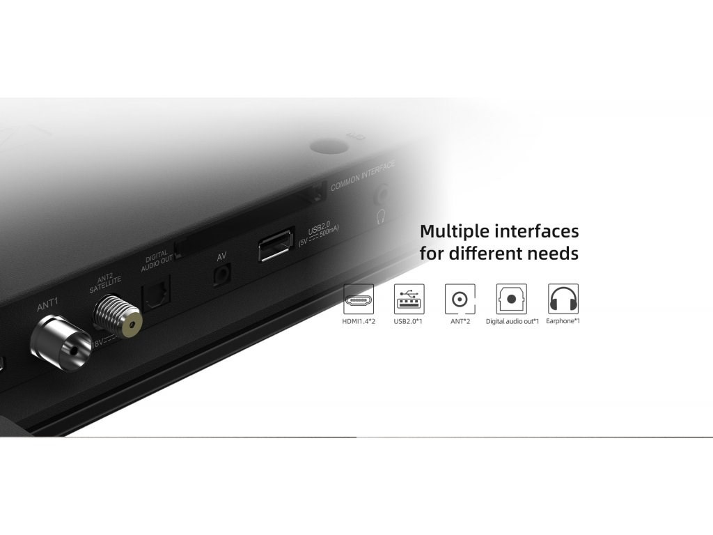 Vstupy a výstupy | AV vstup mini, CI+, slúchadlový vstup 3.5 mm, digitálny audio výstup, HDMI 1.4, USB 2.0, LAN, anténa RF a LNB |
