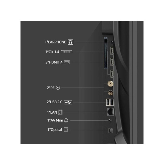 | Vstupy a výstupy: | AV vstup mini, CI+, slúchadlový vstup 3.5 mm, digitálny audio výstup, HDMI 1.4, USB 2.0, LAN, antény RF a LNB |