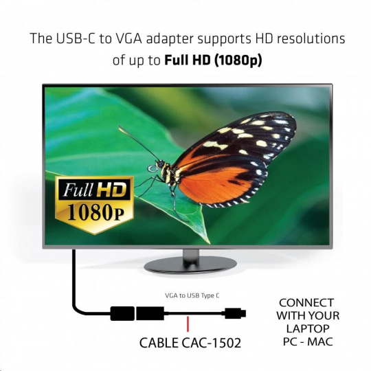 Club 3D CAC-1502 je aktívny prevodník signálu VGA. Tento adaptér USB-C na VGA je najjednoduchšie riešenie pre pripojenie zdrojového zariadenia s rozhraním USB 3.1 typu C s alternatívnym režimom DisplayPort ™ k monitoru alebo projektoru s rozhraním VGA. Adaptér je adaptér je kompaktný a vysoko prenosný. Napájaný cez USB-C port, adaptér nevyžaduje žiadne externé napájanie a je tiež ideálny pre použitie s notebookmi a ultrabookmi.