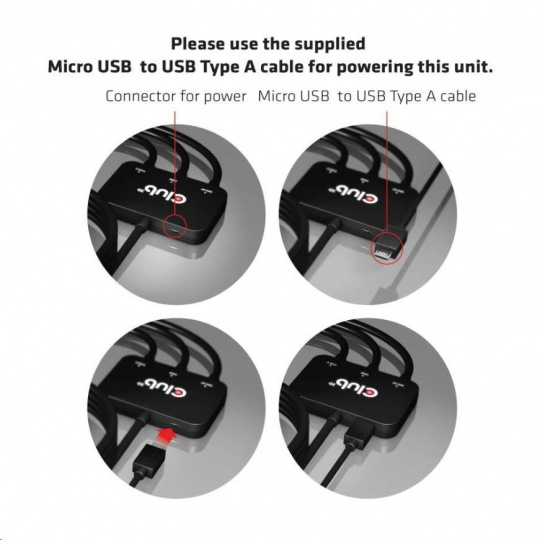 Na pripojenie adaptéra k zariadeniam použite jeden z našich káblov HDMI™, USB typu C a/alebo Mini DisplayPort™ (predlžovací): V prípade, že potrebujete pomoc pri výbere správneho kábla, navštívte našu webovú stránku www.klub-3d.com alebo nám napíšte na support@club-3d.com a bude nám potešením vám pomôcť.