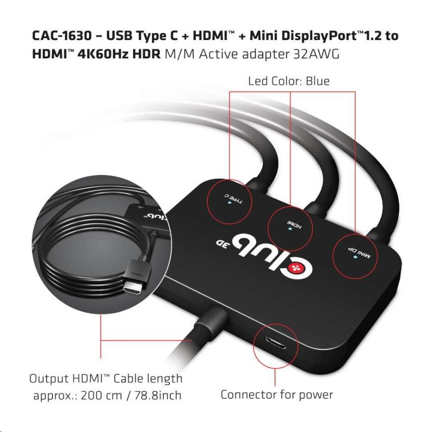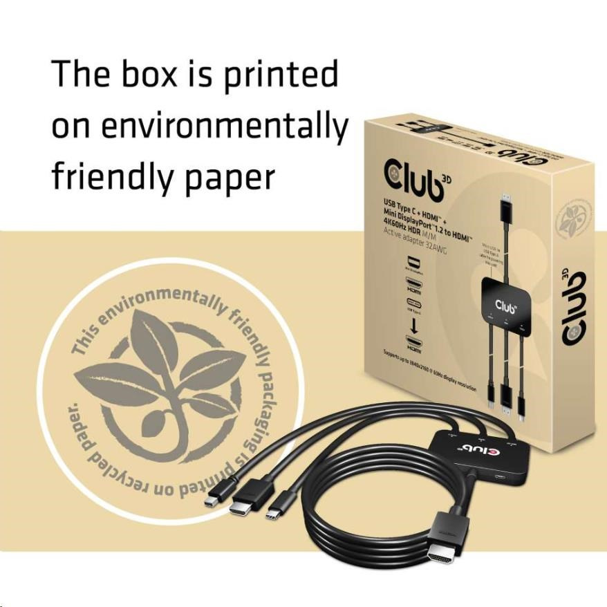 Club3D Active USB Type-C + Mini DP adaptér 1.2+ HDMI na HDMI 4K60Hz HDR, M/M, 32AWG