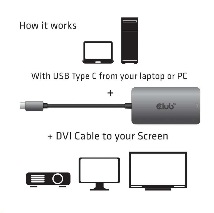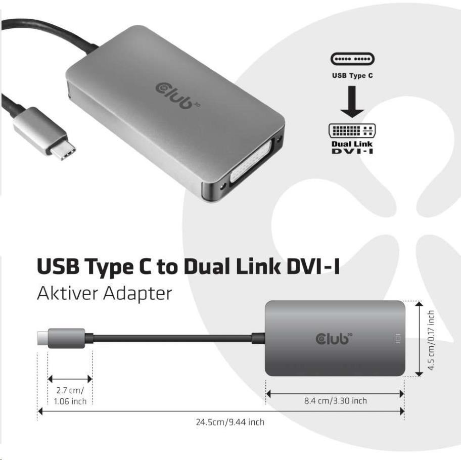 Club3D Active USB Type C to DVI-I Dual Link Adapter, HDCP on