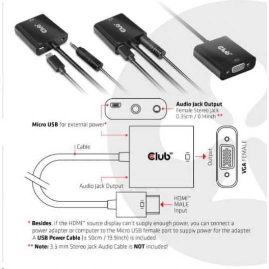 Club 3D CAC-1302 je aktívny HDMI™ 1.4 na prevodník signálu VGA. Umožňuje konvertovať digitálny signál HDMI™ na analógový signál VGA a extrahuje zvukový signál zo signálu HDMI™ prostredníctvom zvukového portu R/L.