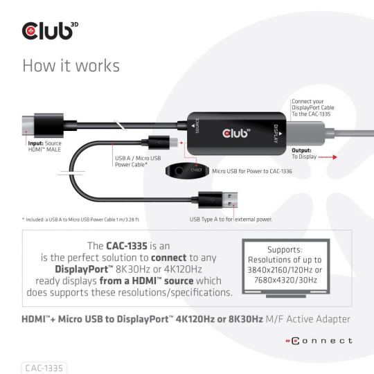 | In the box | - CAC-1335 HDMI™+ Micro USB to DisplayPort™ 4K120Hz or 8K30Hz M/F Active Adapter - USB Type-A to Micro USB M/M 1m / 3.28 ft cable for powering the adapter |