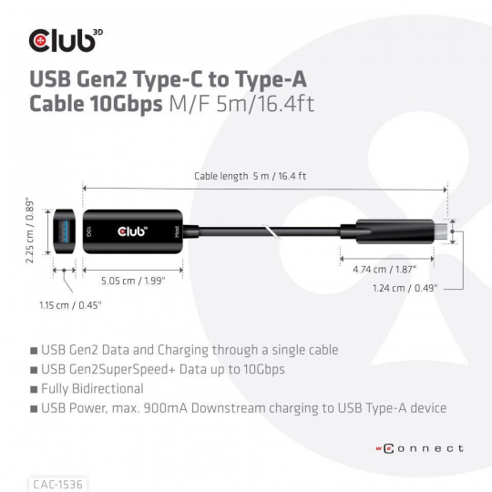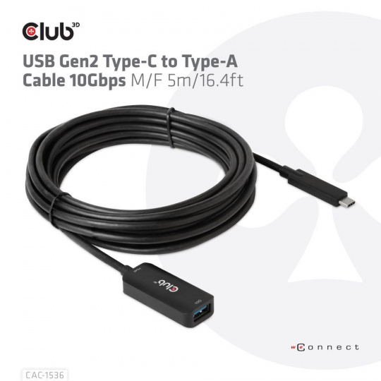 Club 3D CAC-1536 Kábel USB Gen2 Type-C na Type-A 10Gbps M/F 5m/16.4ft kábel pripojí váš notebook, tablet alebo telefón s výstupom USB typu C k vašim obľúbeným existujúcim periférnym zariadeniam, príslušenstvu a nabíjačkám s bežným konektorom USB typu A. Umožňuje prenos dát a napájanie cez jeden kábel a oboma smermi. Tento kábel podporuje rozhranie USB 3.2 GEN 2. SuperSpeed+ dáta až do 10 Gb/s a výstup až 900 mA na downstream nabíjanie alebo napájanie notebooku, tabletu alebo smartfónu s rozhraním USB typu A.