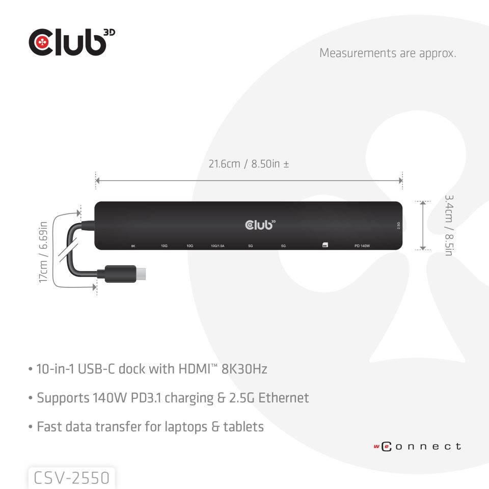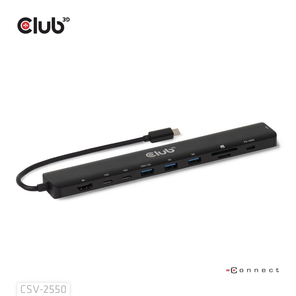 Club 3D CSV-2550 je prenosná dokovacia stanica 10-1 USB-C 10Gbps na HDMI 8K30Hz PD3.1 Max.140Watt, ktorá predstavuje ideálne riešenie pre rozšírenie portu USB-C alebo Thunderbolt hostiteľa (PC/Laptop/Mobilný telefón atď.), najmä pre hostiteľov s jediným portom USB-C. Tento rozbočovač umožňuje výstup HDMI s max. 8K30Hz alebo 4K144Hz vysokou obnovovacou frekvenciou pre prirodzenejší a plynulejší vizuálny zážitok pri súčasnom prenose dát USB 10Gbps. Dátové porty 3x USB-A a 2x USB-C umožňujú pripojiť 5 zariadení USB súčasne. SD/Micro SD umožňujú vložiť 2 sloty pre karty súčasne pre prenos dát alebo pre čítanie/zápis informácií na hostiteľskom počítači. Port RJ45 umožňuje hostiteľovi získať prístup k 2,5Gigabitovému Ethernetu. Okrem toho podporuje USB-C samica PD 3.1 s maximálnym 140W PD nabíjaním. Môže fungovať na všetkých hostiteľských zariadeniach USB-C s podporou režimu DP Alt.