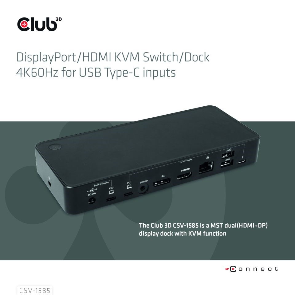 Club 3D CSV-1585 je MST dockovacia stanica s duálnym (HDMI+DP) displejom s funkciou KVM. Dva USB Type-C vstupy pre pripojenie dvoch rôznych hostiteľov na rýchle zvýšenie produktivity medzi dvomi hostiteľmi, stačí jedno kliknutie na horné tlačidlo alebo kliknutím na tlačidlo diaľkového ovládača pripojeného kábla. 3xUSB Type-A+3xUSB Type-C poskytujú dostatočné pripojenie pre externé zariadenia s prenosom dát až 5Gbps. 120W jednosmerným zdrojom napájania poskytuje 65W nabíjanie (PD) pre nabíjanie vášho notebooku USB Type-C alebo hostiteľských zariadení. Kompatibilné s akýmkoľvek zariadením podporujúcim režim DP Alt Mode s portom USB Type-C, ako je notebook, stolný počítač, tablet, telefón atď. Podpora nabíjania pomocou portov PC1 a PC2, stlačením tlačidla POWER SWITCH prepnete vstupné napájanie. Použite 20V/6A 120W DC napájací adaptér na napájanie dockovacej stanice, medzi 65W nabíjaním pre hostiteľa PC2 súčasne. Externé napájanie pre PC1 cez port USB Type-C1, výkon nabíjania závisí od adaptéra PD. So zámkom Kensington. Zapoj a hraj.