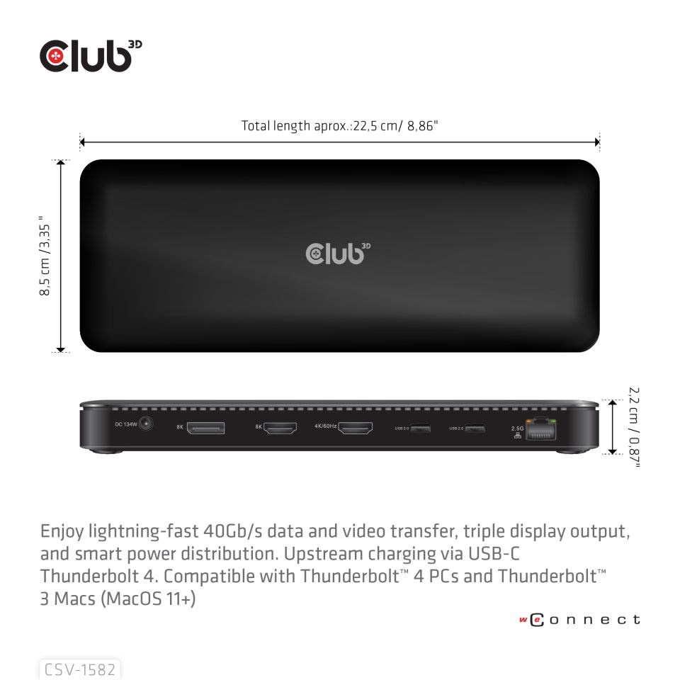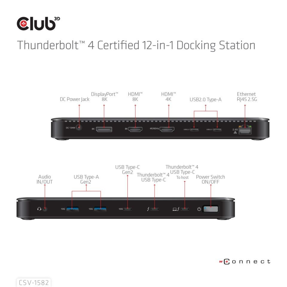 Club 3D CSV-1582 je certifikovaná docking station Thunderbolt™ 4 12 v 1, ktorá poskytuje najmodernejšie, najefektívnejšie a najuniverzálnejšie dostupné I/O riešenie s rýchlosťou až 40 Gb/s pre dáta a video. Kombinácia funkcií TB4 so jednoduchosťou integrovaného docking station, ktorá vám umožní vysielať 3 streamy na 3 displeje súčasne s rozšírenými stolnými displejmi na TB4/USB4 Windows PC. Ethernet RJ45 podporuje maximálnu šírku pásma 2,5G. Porty USB podporujú prenos dát rýchlosťou až 10G. Docking station podporuje funkciu smart power, ktorá umožňuje rozdeľovať energiu podľa spotreby energie pripojeného zariadenia s úplným využitím externého napájania. Je navrhnutá pre počítače so systémom Thunderbolt™ 4 a Mac-y založené na Thunderbolt™ 3 využívajúce MacOS 11 a novšie verzie.