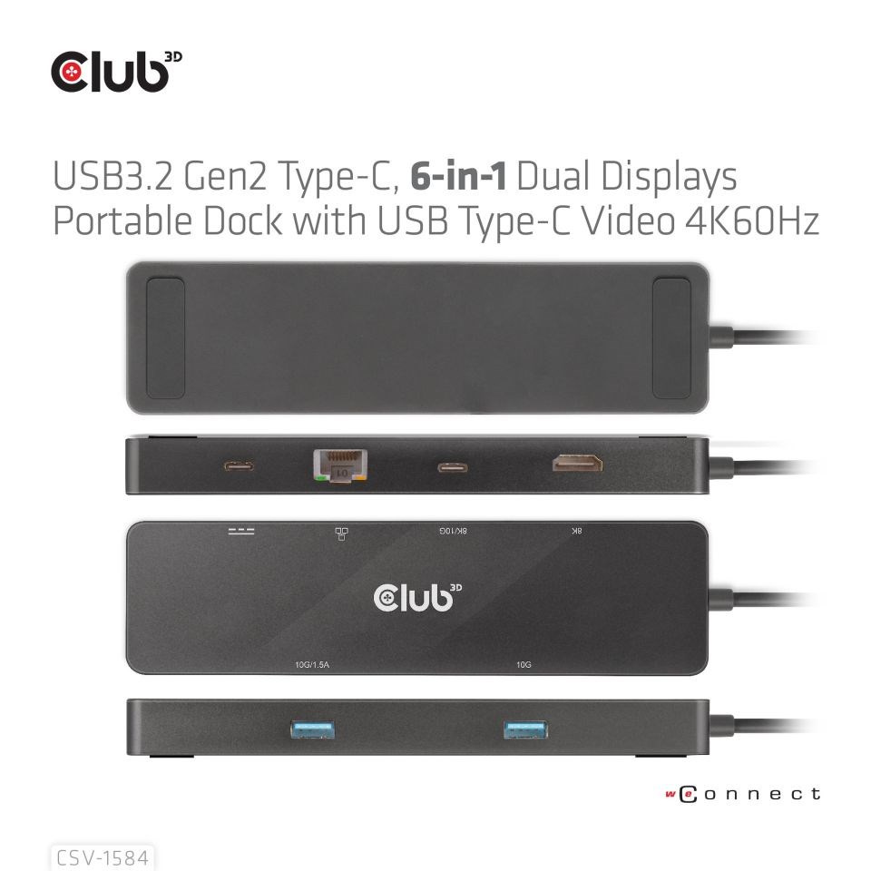 Club 3D CSV-1584 je USB 3.2 Gen2 Type-C, 6-in-1 Hub s HDMI™ 8K30Hz/4K60Hz, 2xUSB Type-A (10G), Ethernet RJ45 (1Gbps) a 2xUSB Type-C, 1x Video 4K60Hz alebo Dátové (10G) a 1xPD3.0 nabíjanie 100 wattov, čo poskytuje ideálne riešenie pre rozšírenie portu USB Type-C alebo hostiteľa Thunderbolt (PC/Laptop/mobilný telefón atď.), najmä pre tých, ktorí sú hostiteľmi s jedným USB Type-C portom. Tento rozbočovač využíva integrovaný obvod s podporou režimu DP1.4 Alt, ktorý umožňuje výstup maximálneho jedného 8K30Hz (DSC) alebo dvoch rôznych videí (2× 4K60Hz) a port USB Type-C Video tiež podporuje prenos dát USB3.2 Gen2 s maximálnou rýchlosťou 10 Gb/s. 2 video porty USB Type-A a USB Type-C umožňujú pripojiť 3 USB zariadenia súčasne. Port Gigabit Ethernet vám umožní surfovať na internete, port USB Type-C PD Charging podporuje max. 100W PD Charging. Môže fungovať na všetkých hostiteľoch USB Type-C s podporou režimu DP Alt.