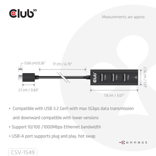 Club 3D CSV-1549 je dokovacia stanica USB-C 3.2 so 3 portami USB-A s gigabitovým Ethernetom a je navrhnutá štýlovým spôsobom + je veľmi tenká, takže sa ľahko prenáša. CSV-1549 vám umožňuje súčasný prístup k 3 portom USB 3.2 a portu Ethernet 10/100/1000 z jediného up-linku USB-C 3.2. Zariadenie je spätné kompatibilné so štandardom USB 2.0, ale to bude mať vplyv na výkon. Všetky 3 porty USB sú kompatibilné s prenosom údajov max. 5 Gb/s. Ethernetový port je kompatibilný s Gigabit Ethernet 10/100/1000 (RJ45) a plne duplexný s riadením toku.