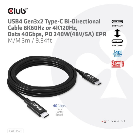 Obojstranný kábel Club 3D CAC-1579 USB4 Gen3x2 Type-C 8K60Hz alebo 4K120Hz, Data 40Gbps, PD 240W(48V/5A) EPR M/M 3m / 9,84ft prepojí váš notebook, tablet alebo telefón s výstupom USB4 Type-C k vašim obľúbeným existujúcim periférnym zariadeniam, príslušenstvu a nabíjačkám. Umožňuje video, dáta a napájanie cez jeden kábel a oboma smermi. Zabudované čipy Re-timer s vylepšeným signálom na zlepšenie funkcií na dlhšiu vzdialenosť ako pasívny kábel USB Type-C, spolu s čipmi E-marker na oboch koncoch kábla poskytujú tomuto káblu podporu pre USB4 Gen3x2 Type-C Bi-smerové video 8K60Hz alebo 4K120Hz, Data 40Gbps, PD 240W (48V/5A) EPR M/M na dĺžku 3 m / 9,84 stôp pre nabíjanie alebo napájanie vášho notebooku, tabletu alebo smartfónu.