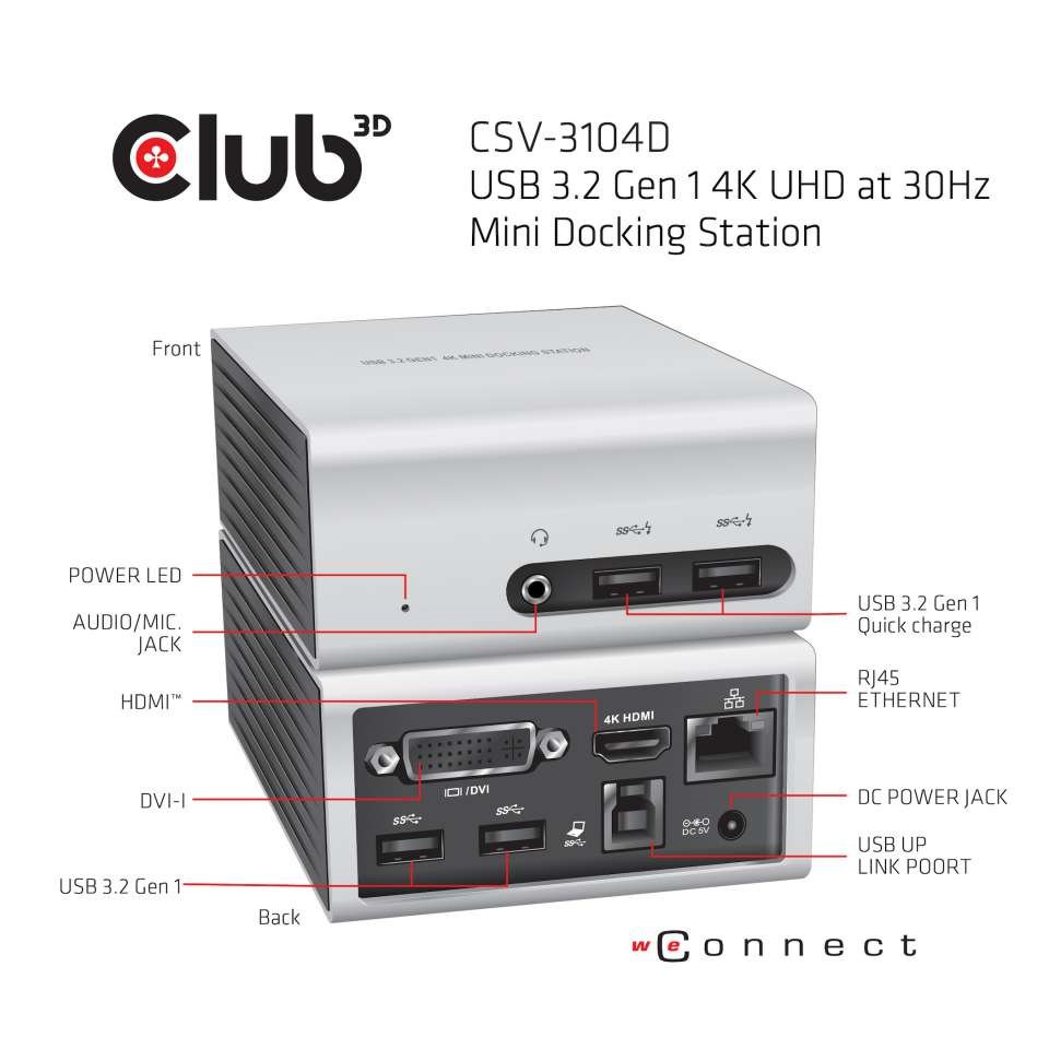 SenseVision USB 3.2 4K UHD Mini dokovacia stanica Vďaka pokročilému čipu DisplayLink DL-5900 vnútri, USB 3.1 Gen 1 4K UHD Mini dokovacia stanica vám dokáže ponúknuť dokonalé riešenie na pripojenie všetkých vašich obľúbených zariadení USB (*4), ako aj na pripojenie dvoch externých monitorov prostredníctvom konektora HDMI™ a DVI-D. Okrem pripojenia k sieti Ethernet ponúka aj zvukový/mikrofónový výstup, a to všetko prostredníctvom jediného kábla USB. Vďaka svojmu pohodlnému a kompaktnému dizajnu je Club 3D USB 3.1 Gen 1 4K UHD Mini dokovacia stanica je všestranný nástroj, ktorý vám poskytne maximálnu funkčnosť vašej malej náhrady stolného počítača alebo mobilného spoločníka. Dizajn: TECHNICKÉ ŠPECIFIKÁCIE .