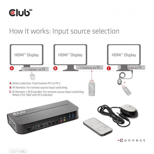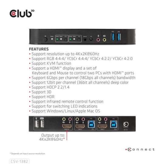 CSV-1382 je vysoko výkonný prepínač HDMI™ KVM (klávesnica, video a myš). Presúva videá s vysokým rozlíšením až do 4096 × 2160 pri 60 Hz rozlíšení a zvuk z akéhokoľvek zdroja HDMI™ na akýkoľvek displej s podporou HDMI™. Tento prepínač HDMI™ KVM má nielen funkciu prepínania stlačením tlačidla, ale aj inteligentnú funkciu a funkciu hot pluggable.