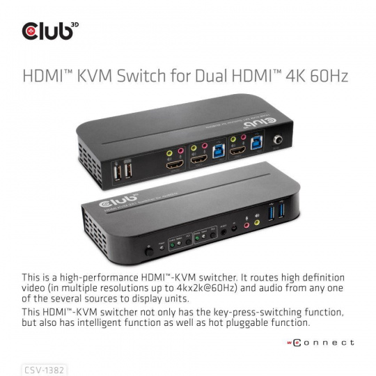 Sieťový prepínač Club3D - Prepínač, HDMI KVM prepínač - Dual HDMI 4K 60Hz
