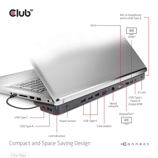 Club 3D CSV-1568 USB Gen2 Type-C Triple Display DP™ Alt mode + Smart PD Charging Dock so 120 W PSU je integrované riešenie, ktoré kombinuje video, dáta, napájanie, ethernet a zvuk. Má 4 videá (výstup 3 videí súčasne v režime MST) na prenos videa, 4 dátové porty USB (2 USB-A 10G, 1 Type-C 10G, 1 USB-A 5G) na prenos dát, 1 inteligentný nabíjací port USB-A na rýchle nabíjanie, 1 gigabitový ethernetový port na superrýchly ethernet, 2 audio porty (3.5 mm audio, Toslink) na počúvanie hudby. Okrem toho je táto dokovacia stanica vybavená dvojitým napájacím konektorom (nabíjanie PD typu C alebo 120W jednosmerný zdroj).