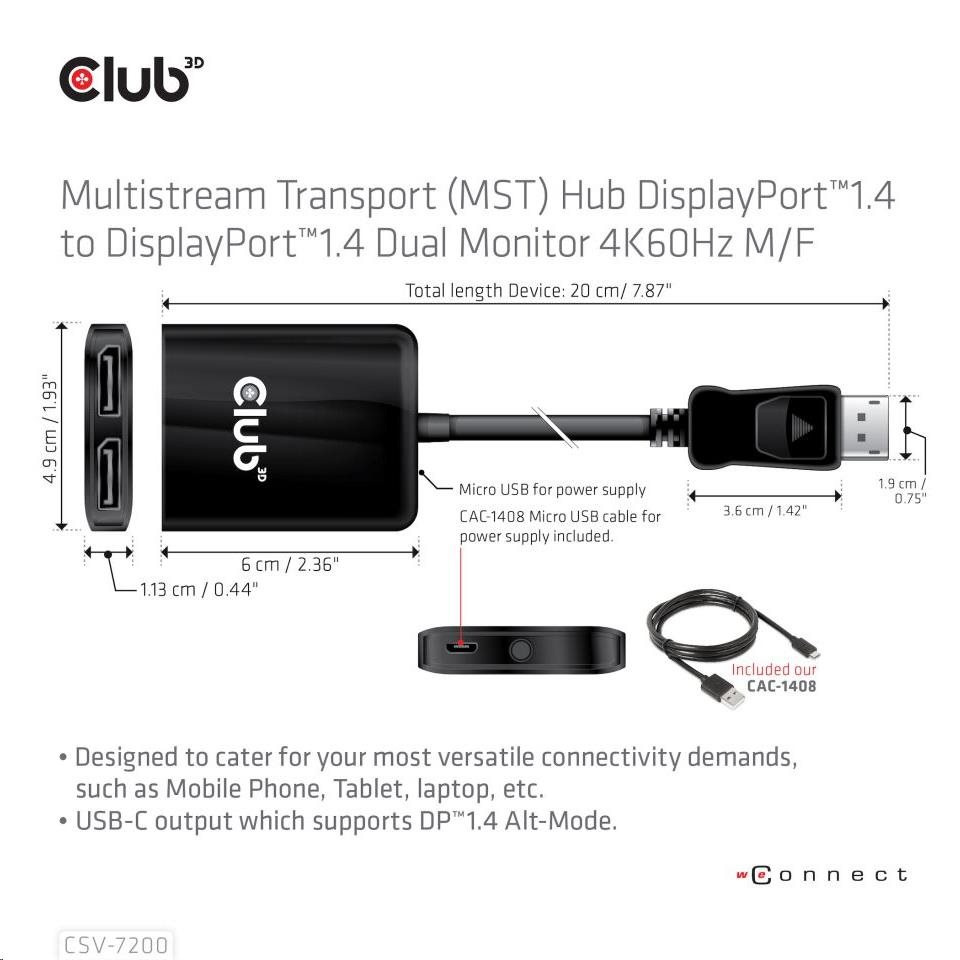 | V krabici | - CSV-7200, Multistream Transport (MST) Rozbočovač DisplayPort™1.4 auf DisplayPort™1.4 Duálny monitor 4K60Hz M/F - CAC-1408, USB 3.2 Kábel Gen1 Type-A na Micro USB M/M 1m /3.28 stôp pre externé napájanie |