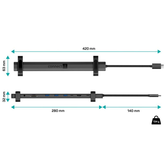 Umožní napájanie a pripojenie ďalších periférií ako sú napr. monitor, projektor, televízia, myš, klávesnica, MP3 prehrávač, skener, tlačiareň, digitálny fotoaparát, externý pevný disk, flashdisk, slúchadlá atď. Ide o výborný doplnok bežných stolných počítačov aj prenosných notebookov, ktoré nemajú dostatok vlastných portov. Vďaka svojim kompaktným rozmerom je ideálnym príslušenstvom k notebookom na cesty. Pre pripojenie k počítaču je určené rozhranie USB-C (Type-C). Hub je možné napájať pomocou USB-C Power Delivery portu. K hubu môžete pripojiť akékoľvek zariadenie štandardu HDMI, USB-C (Type-C), USB 3.0, 2.0 alebo 1.1 ako sú myš, klávesnica, MP3 prehrávač, skener, tlačiareň, digitálny fotoaparát, externý pevný disk, flashdisk atď.