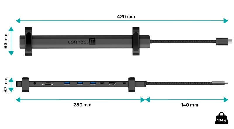 Prakticky tvarovaná USB-C dokovacia stanica "Multi10in1" pre pripojenie až 10 periférií (2x USB-C, 1x HDMI, 3x USB-A, 3.5 mm jack, RJ45 Gigabit Ethernet. SD karta, MicroSD karta).