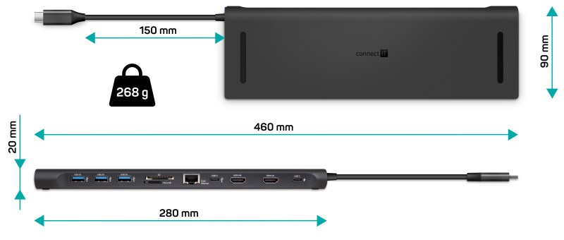Prakticky tvarovaná USB-C dockovacia stanica "Multi11in1" na pripojenie až 11 periférií (2x USB-C, 2x HDMI, 3x USB-A, 3,5 mm jack, RJ45 Gigabit Ethernet. SD karta, MicroSD karta).