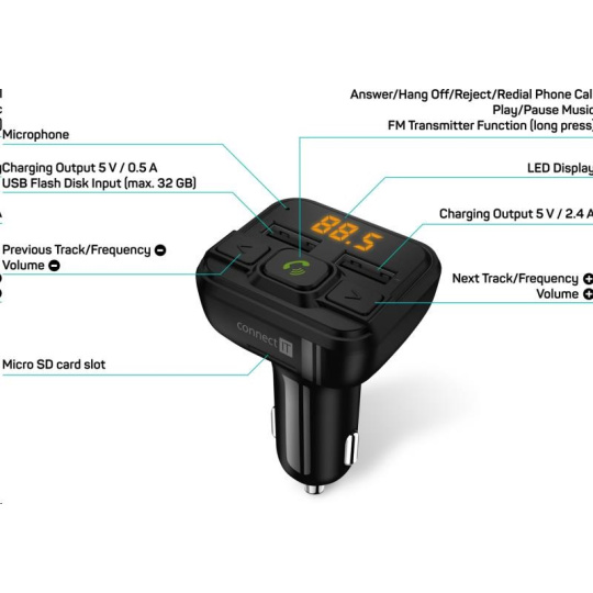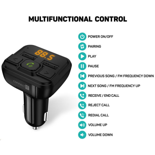 Bluetooth vysielač v kombinácii s dvojportovou nabíjačkou je multifunkčné zariadenie do vášho auta, vďaka ktorému môžete nielen nabíjať mobilné zariadenia, ale aj počúvať hudbu zo svojho USB flash disku alebo mobilného telefónu. Vysielač je vybavený digitálnym displejom a tromi ovládacími tlačidlami pre jednoduché a komfortné ovládanie všetkých funkcií. Navyše je možné pripojiť aj pamäťovú Micro SD kartu. Samozrejmosťou pre toto zariadenie je aj možnosť bezdrôtového spárovania s vaším mobilným telefónom na uskutočňovanie telefónnych hovorov. Na tento účel je zabudovaný aj mikrophone.