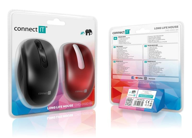 Bezdrôtová optická myš s unikátnou funkciou "Long Life", vďaka ktorej môžete používať myš celý rok bez potreby výmeny batérií. Myš tiež disponuje možnosťou výmeny krytu, vďaka ktorej môžete striedať medzi čiernou a červenou farbou myši. Tichý chod tlačidiel, ktoré pri klikaní nevydávajú žiadny zvuk, nájde svoje využitie všade tam, kde používateľ požaduje absolútnu súkromie a pokoj. Dizajn myši umožňuje uschovať USB-A Nano prijímač pod krytom myši a zabrániť tak jeho strate. Súčasťou balenia je červený kryt a originálna alkalická tužková batéria CONNECT IT.