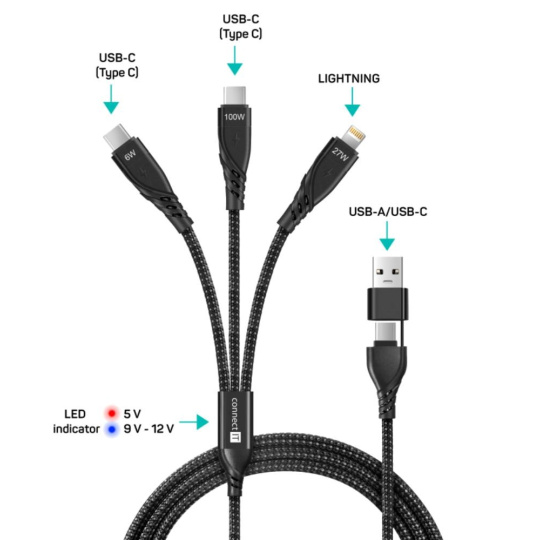 CONNECT IT Nabíjecí kabel Wirez 6v1, USB-C/USB, Lightning + 2x USB-C, 1.25m, černá