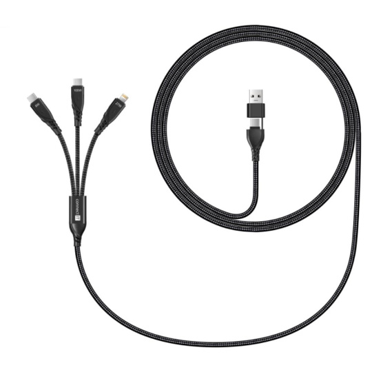 Univerzálny nabíjací kábel 6v1 pre nabíjanie zariadení s konektormi 2x USB-C,1x Lightning so vstupným konektorom USB-C a redukciou na USB-A. Umožňuje nabíjanie až troch zariadení súčasne s podporou rýchleho nabíjania pomocou max. prúdového toku 5 A. Špeciálna manžetová nadstavba konektorov zaručuje lepšiu prístupnosť k nabíjacím zásuvkám mobilných telefónov v puzdre.