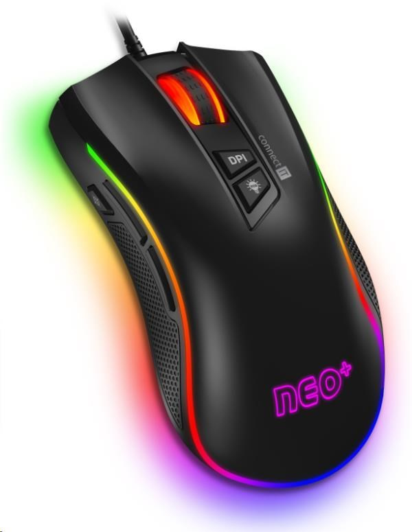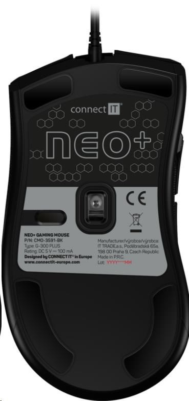 Okrem bežných funkcií je táto myš jedinečná svojou nastaviteľnou veľkosťou s odnímateľným pravým bočným panelom. Takto si môžete myš prispôsobiť svojim potrebám. Časť myši je pokrytá povrchom "honeycomb grip" pre stabilnejší a pevnejší úchop aj počas dlhšieho hrania. Táto myš sa dodáva s hárkom propagačných nálepiek "CONNECT IT NEO" a softvérom, ktorý je k dispozícii na bezplatné stiahnutie na adrese www.connectit-europe.com. Táto séria je samozrejme vybavená prémiovým opleteným napájacím káblom a pozláteným konektorom USB.