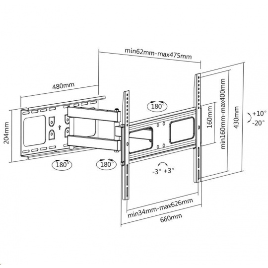 - Rozmery držiaka (š x v x h): 660 x 430 x 62~475 mm