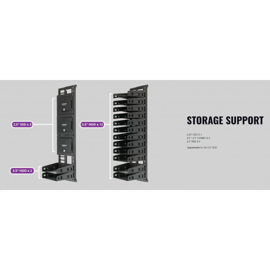 Kryt PSU je modulárny vďaka dvom nezávislým dielom, zatiaľ čo systém krytu káblov obsahuje 3 samostatné diely, z ktorých každý umožňuje montáž úložiska alebo čerpadla pre kapalinové chladenie.