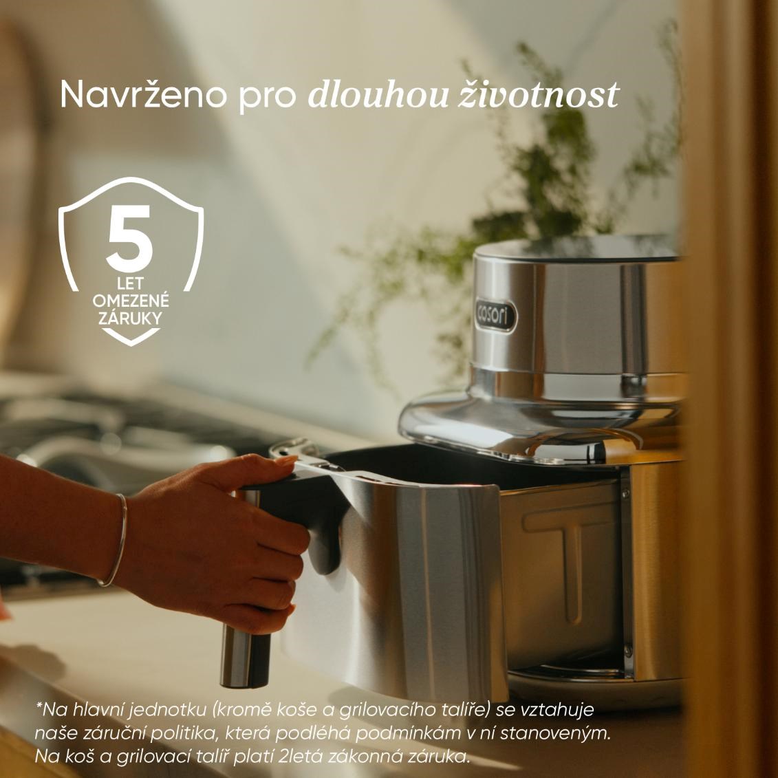 Súčasťou balenia je elegantná kuchárska kniha plná inšpirácie, dostupná aj v online českej verzii, ktorá vás krok za krokom prevedie zdravým varením. Predĺžená 5-ročná záruka*, testovaná životnosť 2000 hodín a odolnosť voči 300 cyklom umývania v umývačke riadu dokazujú, že Iconic je stvorený pre roky každodenného potešenia. To všetko v tele, ktoré vyzerá rovnako dobre, ako varí. COSORI Iconic nie je spotrebič – je to životný štýl, v ktorom sa dizajn, zdravie a výkon spájajú v dokonalej harmónii.