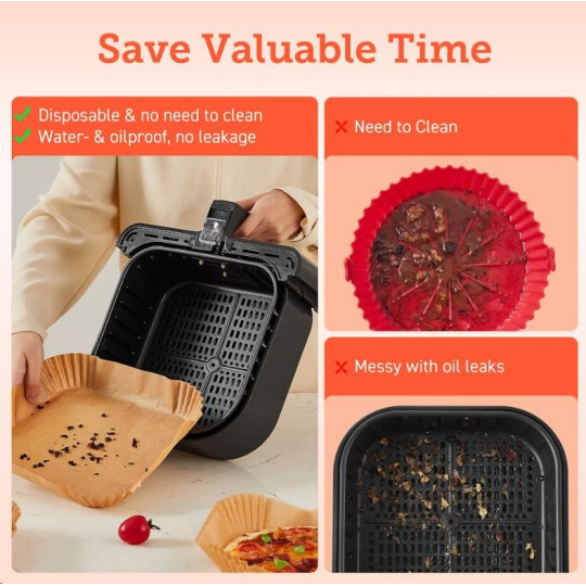Štvorcové jednorazové papiere na pečenie pre teplovzdušné fritézy sú navrhnuté tak, aby sa prispôsobili tvaru koša fritézy, takže ich nemusíte trhať ani strihať. Keď ste pripravení piecť, jednoducho ich vložte do koša.