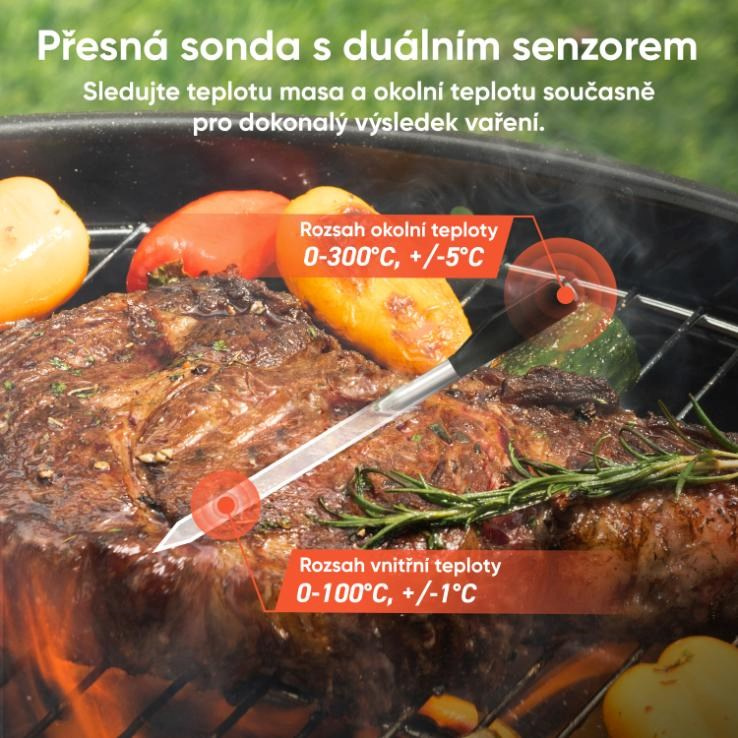 Úplná kontrola nad prípravou mäsa. Vďaka duálnemu senzoru neustále monitoruje vnútornú teplotu mäsa aj teplotu okolia. To zaručuje presné výsledky a eliminuje akékoľvek dohady o správnom stupni prepečenia. Aplikácia vás upozorní, keď je čas otočiť mäso, a dokonca aj keď je ideálny čas nechať ho odpočívať, aby bolo dokonale šťavnaté. Žiadne dohady, len perfektné výsledky pri každom varení.
