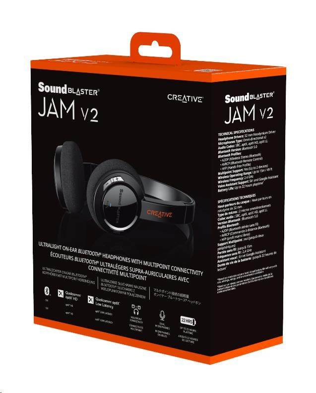 Vaše obľúbené prenosné Bluetooth® slúchadlá na uši sú späť – so starým dizajnom ľahkým ako pierko a vysoko kvalitnými neodymovými meničmi! Produkt Sound Blaster JAM V2 je teraz vybavený technológiou Bluetooth 5.0. Spolu s rozšírenými zvukovými kodekmi aptX™ HD a aptX™ Low Latency poskytuje najlepší bezdrôtový posuch. Užite si bohatý a ohromujúci zvuk. Funkcia Multipoint umožňuje jasne prepínať medzi dvoma rôznymi zdrojovými zariadeniami Bluetooth, bez toho aby ste stratili rytmus.