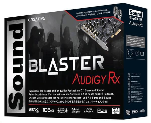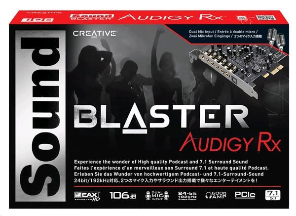 Sound Blaster Audigy Rx je pokročilá zvuková karta, ktorá umožňuje ideálny prechod od zvuku zo základnej dosky k pohlcujúcemu priestorovému zvuku ako v kine. Vďaka vylepšenej súprave cyp, ktorá umožňuje spracovanie nášho legendárneho dozvuku EAX, si používatelia Sound Blaster Audigy Rx môžu vychutnať vynikajúci 7-kanálový viackanálový zvuk.1. Okrem toho má táto karta 106 dB SNR a Sound Blaster Audigy Rx Control Panel, špeciálny počítačový softvér, ktorý umožňuje plne ovládať každý aspekt zvukovej karty.