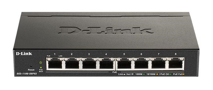 D-Link DGS-1100-08PV2 8-portový gigabitový inteligentný riadený prepínač PoE, rozpočet PoE 64 W, bez ventilátora