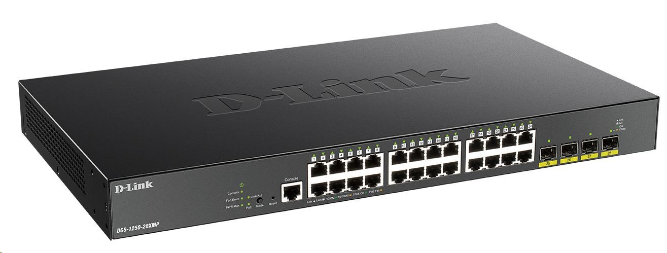 D-Link DGS-1250-28XMP 28-portový gigabitový inteligentný PoE switch, 24x GbE PoE+, 4x SFP+, PoE 370W