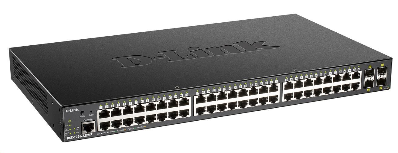 D-Link DGS-1250-52XMP 52-portový gigabitový inteligentný PoE switch, 48x GbE PoE+, 4x SFP+, PoE 370W