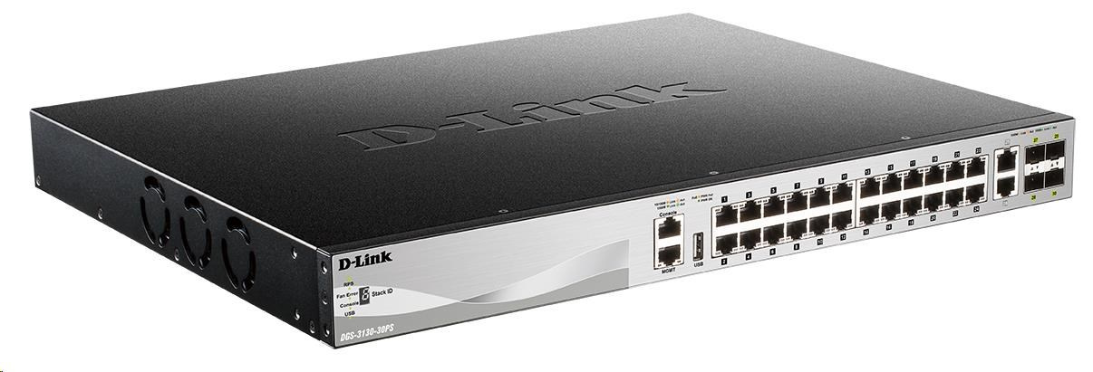 D-Link DGS-3130-30PS/SI L3 stohovateľný gigabitový riadený PoE switch, 24x PoE gigabit, 2x 10GBASE-T, 4x SFP+, 370W PoE