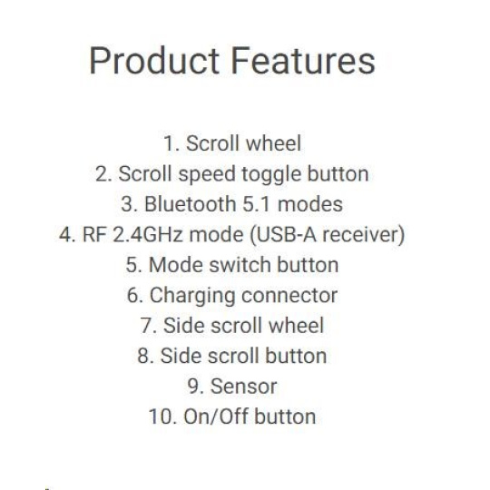 | Vertical and horizontal scrolling, rechargeable battery, thumb rest, fast scrolling, track-on-glass sensor |