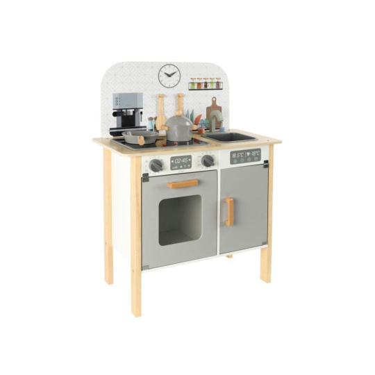 Menšia detská kuchynka v neutrálnych farbách, doplnená o bohaté príslušenstvo a textilný kuchársky set ZDARMA, premení dievčatá aj chlapcov na skutočných kuchárov. Kuchynka v škandinávskom štýle, so spotrebičmi a úžasnými doplnkami, je vhodná do každej miestnosti. Menšia drevená kuchynka je edukatívnou hračkou, ktorá umožní deťom vyskúšať si varenie, pečenie a ďalšie činnosti bezpečným detským spôsobom. Pri hraní v kuchynke deti zdokonalia svoje zručnosti a ešte si užijú veľa zábavy.