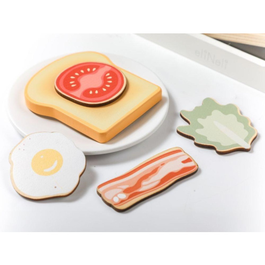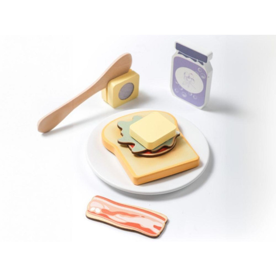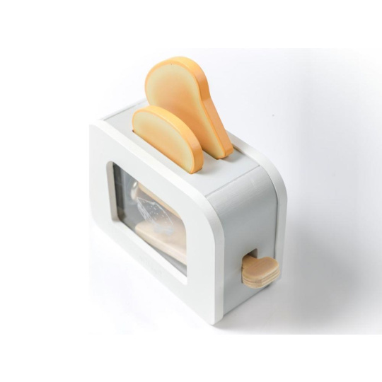 Drevený toustovač v jedinečnom dizajne, s priehľadnou vnútornou časťou, je edukatívna hračka, ktorá umožní deťom každý deň pripravovať chrumkavé toasty s maslom, džemom, se slaninou, šalátom alebo paradajkou pre obľúbené panenky, plyšáky aj rodičov. Drevená hračka v podobe detského toustovača s príslušenstvom je štýlovým doplnkom do detskej kuchynky alebo obchodu.