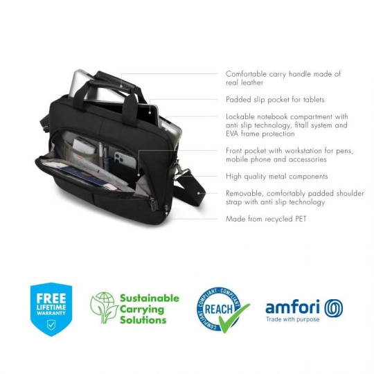 DICOTA is an official participant in the Microsoft Designed for Surface program, which certifies exceptional accessories created by third-party manufacturers to work seamlessly with Surface devices. The Eco Slim Case PRO reliably accompanies you everywhere and meets the highest standards in terms of quality, functionality and protection. The fit-all system separating wall in the notebook compartment lies protectively around your Microsoft Surface device and fits automatically to sizes up to 15". The perforated and thus light EVA foam material optimally protects the edges of your notebook. The high-quality genuine leather handles ensure comfortable transportation for daily use. Besides the notebook compartment, the Eco Slim Case PRO features a well-padded slip pocket designated to tablets up to 10.5". Furthermore, the bag offers generous storage space for documents at the back of the case. The front pocket allows you to organize your personal equipment and additional mobile accessories. With its trolley fastening strap, the bag ensures perfect comfort when travelling along with luggage. The Eco Slim Case PRO is perfect for you if you are always on the go and want to support the recycling of PET bottles with an eco-friendly case. Made of 7.5 recycled PET bottles Compatible with any Surface Pro, Pro X, Laptop, Go, Laptop Go, Laptop SE, Book, Laptop Studio as well as Duo Lockable and cushioned notebook compartment with fit-all system and anti-slip technology Maximum security thanks to Memory Foam and EVA frame protection Notebook compartment for Surface devices up to 15" Cushioned pocket for tablets up to 10.5" Spacious front pocket with zip-pocket and workstation for mobile accessories Open document compartment on the rear High-quality metal features Adjustable shoulder strap with comfortable padding and anti-slip technology Comfortable carry handles made of real leather Trolley belt More Information More Information Item number D30990-DFS Color black Volume in liters 0 Material 900Dx600D rPET Polyester Warranty Lifetime / 30 years EAN 7640186417709 Max. Device Measurements (mm) 340 x 40 x 245 mm 13.39 x 1.57 x 9.65 inch Product Measurements (mm) 375 x 80 x 285 mm 14.76 x 3.15 x 11.22 inch Weight 0.71 kg / 1.56 lbs.