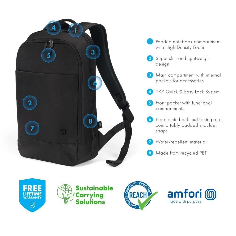 Eco Backpack Slim MOTION poskytuje ideálnu ochranu pre notebooky medzi 13 a 15,6" vďaka výplni z vysoko hustej peny (HDF). Ďalšie kapsy na zips pre dokumenty a denníky. Predná kapsa má praktické menšie priečinky, do ktorých si môžete usporiadať menšie predmety, ako je váš smartfón, pero alebo nabíjačky. Ergonómická výplň batohu zabezpečuje pohodlné nosenie na chrbte a polstrované ramenné popruhy je možné nastaviť pre ešte väčší komfort. Taška je vyrobená z vodeodpudivého materiálu, ktorý chráni obsah aj počas daždivých dní. Eco Backpack Slim MOTION je preto ideálny pre vás, ak ste stále na cestách a chcete podporovať recykláciu PET fliaš pomocou ekologickej tašky.