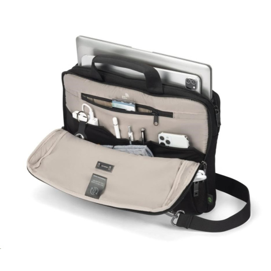 Ľahký, bezpečný a navrhnutý pre ľahkú mobilitu, Slim Case FIVE chráni vaše potrebné veci bez toho, aby bol objemný. Uzamykateľná priehradka na notebook s ochranou DCT Notebook Protection zabezpečuje maximálnu bezpečnosť, zatiaľ čo integrovaná kapsa bezpečne udrží tablety do veľkosti až 12,9". Predná priehradka so štruktúrovanými kapsami slúži na usporiadanie príslušenstva a samostatná zadná priehradka poskytuje vyhradený priestor pre dokumenty. Je vyrobená zo 16,5" recyklovaných PET fliaš, takže je udržateľnou a praktickou voľbou pre moderných profesionálov.