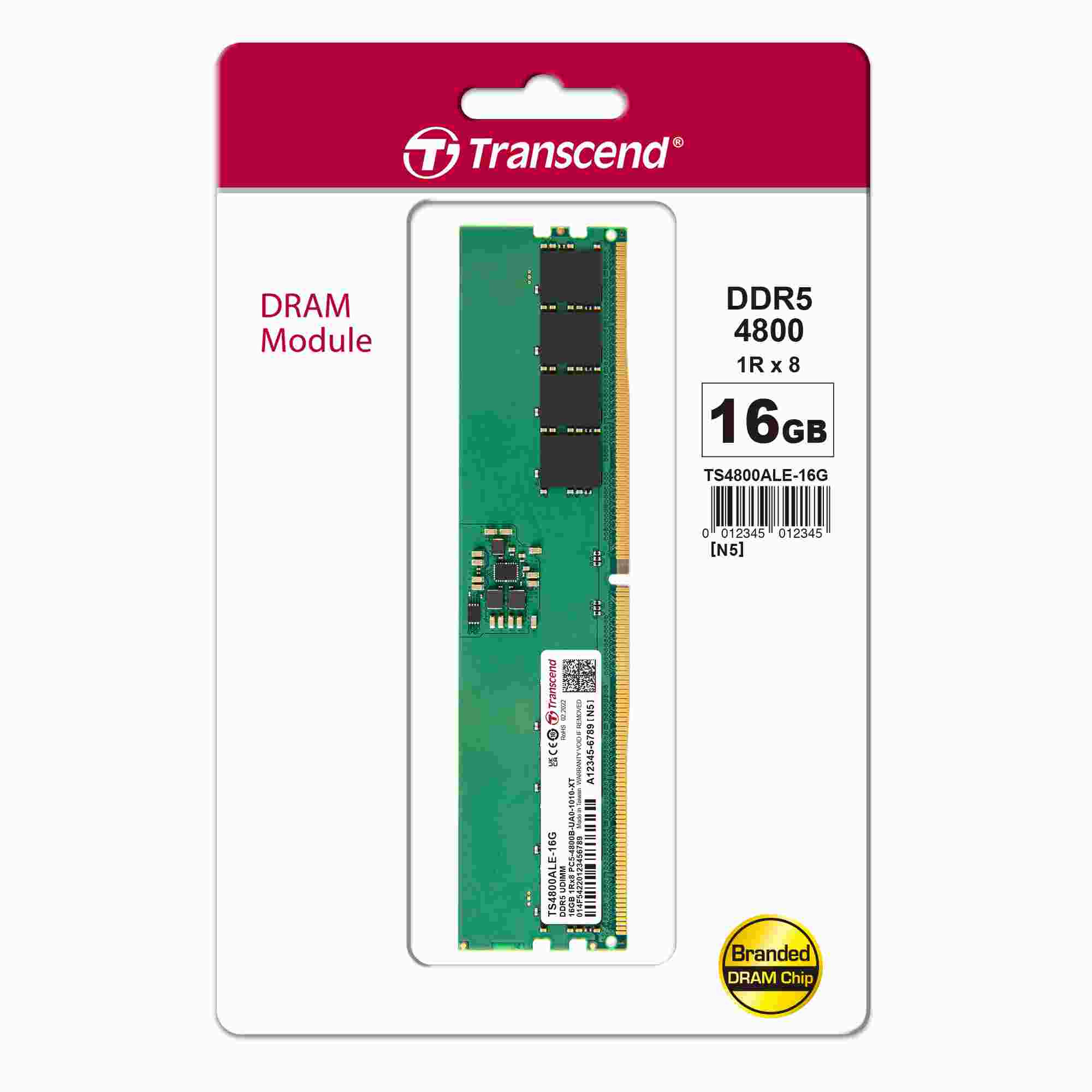 DDR5 DIMM 16GB 4800MHz TRANSCEND 1Rx8 2Gx8 CL40 1.1V