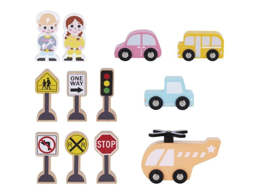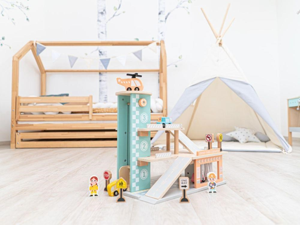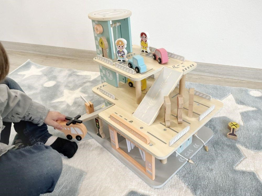 Garáž na autíčka s myčkou, v krásnych jemných farbách, prinesie deťom veľa zábavy. Súčasťou 3-poschodovej drevenej garáže je parádna myčka áut, tankovací stojan, výťah, helipad i množstvo parkovacích miest pre autíčka. Bohaté príslušenstvo v podobe helikoptéry, autíček, dopravných značiek a obsluhy garáže umožní, aby si s garážou pre autíčka vyhralo vaše dieťa samo alebo so svojimi kamarátmi.
